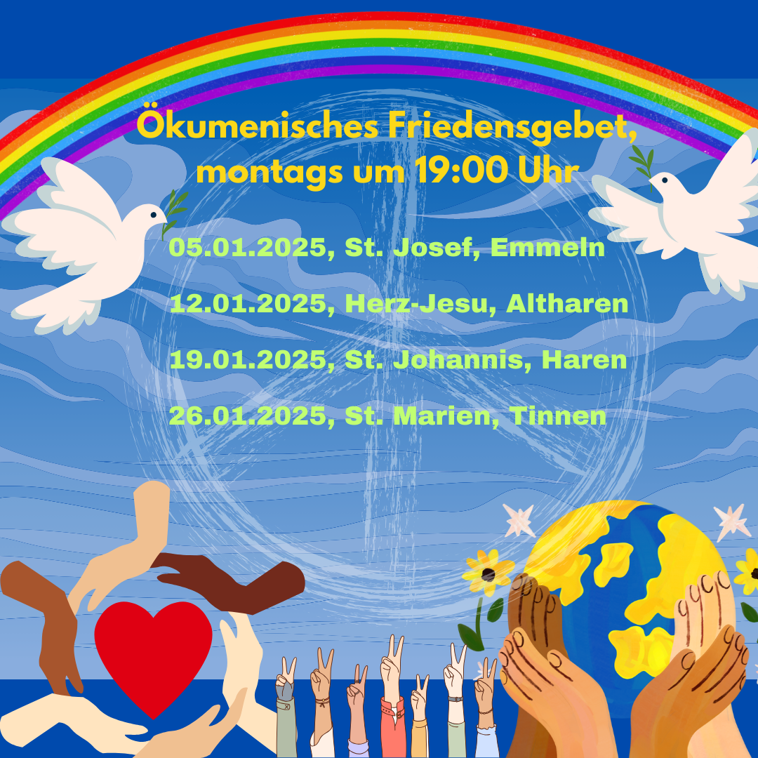 Erstellt am 21. Nov. 2025 Gemeinde: Haren Herzliche Einladung! Seit Ende Februar 2022 beten wir wöchentlich montags für den den Frieden in der Welt! Wir wechseln wöchtentlich in unserer Pfarreiengemeinschaft und mit der ev. KG St. Johannis!