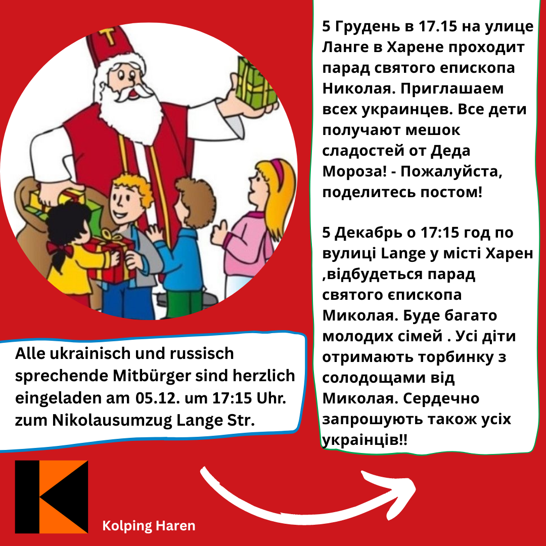 Fr., 05.12.2025, 17:15 Uhr kommt der Nikolaus für unsere Mitbürger aus der Ukraine und Russland