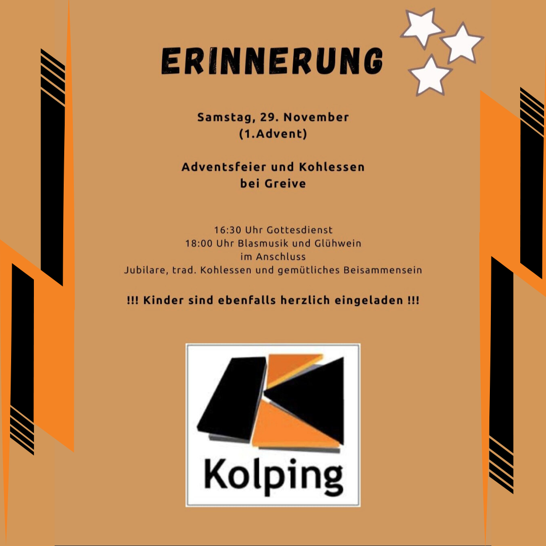 Sa., 29.11.2025, 16:30 Uhr hl. Messe mit Kolping und der Blaskapelle anschl. Adventsfeier
